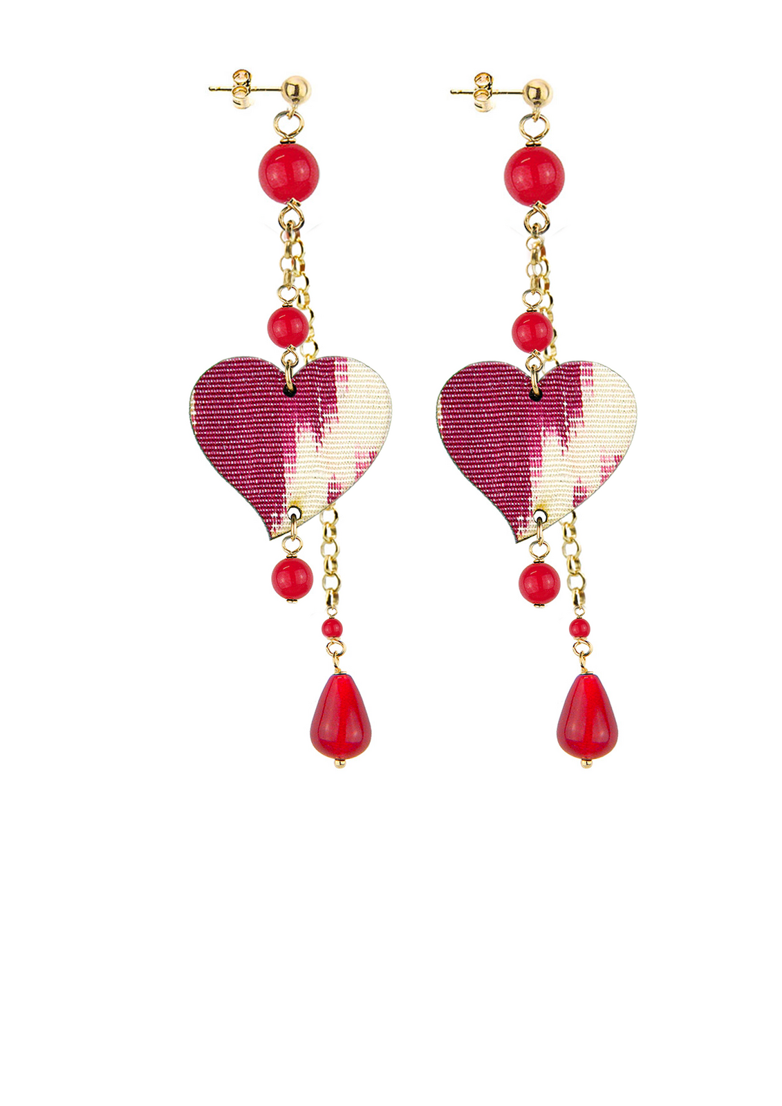 La collezione Samarcanda di Lebole Maison è creata con tessuti Ikat di antichi Kaftani Uzbeki e coloratissime pietre naturali. La coppia di orecchini è asimmetrica: il Kaftano, che è il perno della collezione, si può accoppiare con la sagoma di un’architettura o con il cammello.