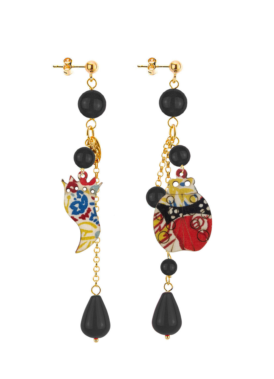 Orecchini Corno E Coccinella Ciuffo Corto Nero