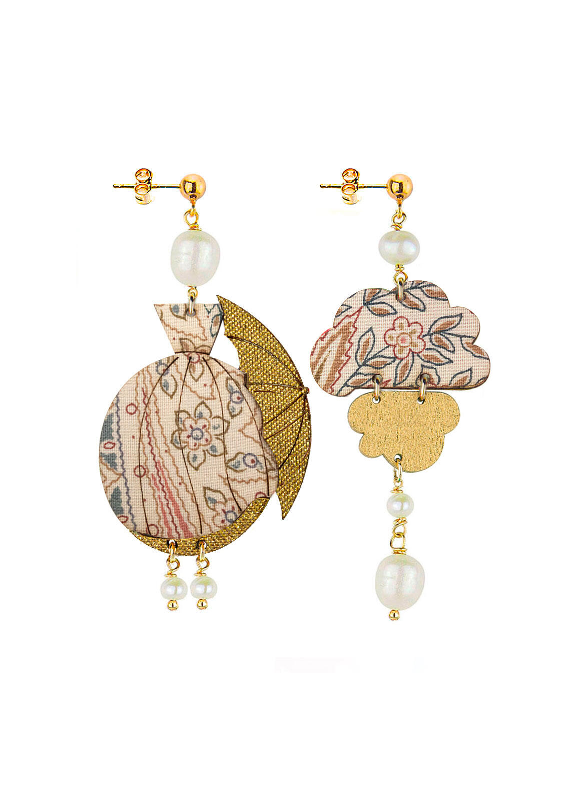 Orecchini in tessuto italiano steso su un'anima di legno, ottone galvanizzato oro e pietre naturali. Lunghezza 7 cm. Chiusura perno e farfalla. Made in Italy
