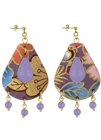 Orecchini realizzati con tessuti di kimono antichi giapponesi stesi su pelle e pietre naturali. Elementi in ottone galvanizzato oro. Lunghezza orecchino 6 cm. Chiusura con perno e farfallina. Made in Italy
