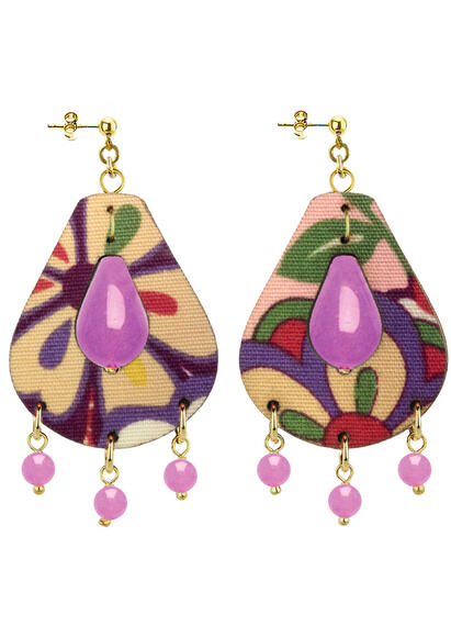 Orecchini realizzati con tessuti di kimono antichi giapponesi stesi su pelle e pietre naturali. Elementi in ottone galvanizzato oro. Lunghezza orecchino 6 cm. Chiusura con perno e farfallina. Made in Italy