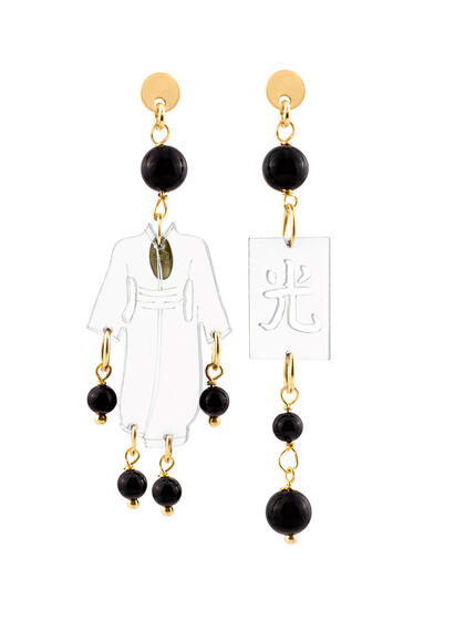 Le immagini raffigurate negli orecchini sono due: una figura vestita con kimono e un ideogramma giapponese che significa luce. Le misure degli orecchini Kimono sono diverse, per riuscire meglio a racchiudere le esigenze di tutte le fruitrici.