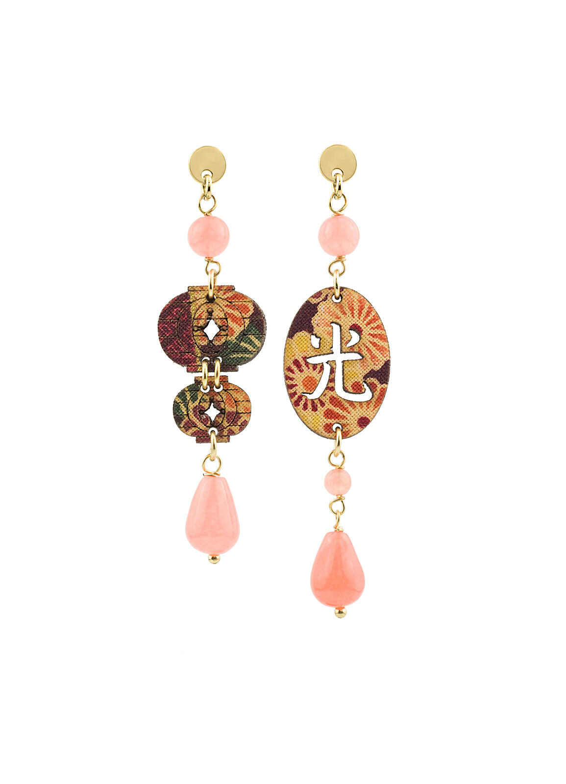 Orecchini in ottone galvanizzato oro, tessuti di Kimono giapponesi stesi su legno e pietre naturali. Lunghezza 6 cm. Chiusura perno e farfalla. Made in Italy