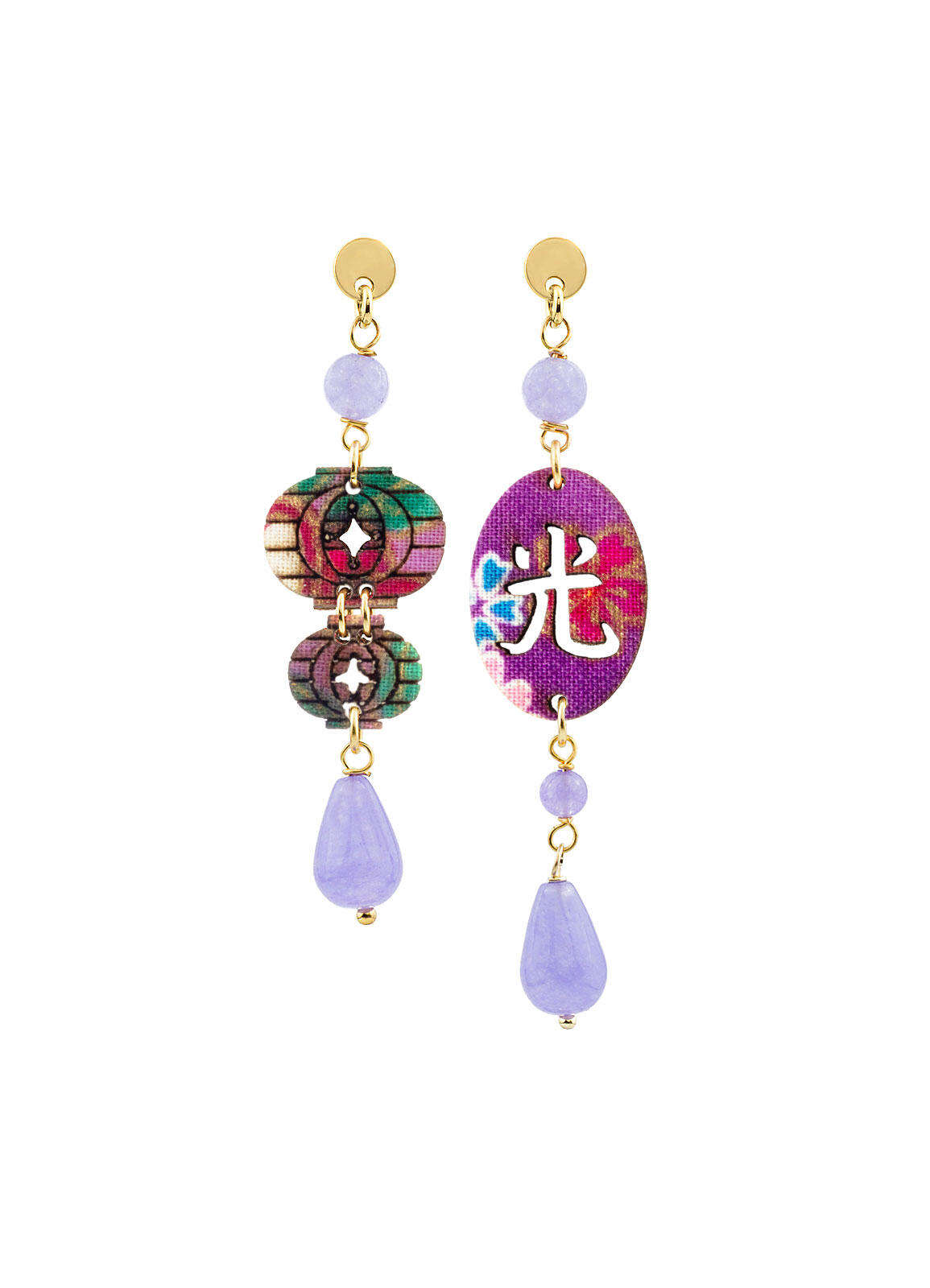 Orecchini in ottone galvanizzato oro, tessuti di Kimono giapponesi stesi su legno e pietre naturali. Lunghezza 6 cm. Chiusura perno e farfalla. Made in Italy